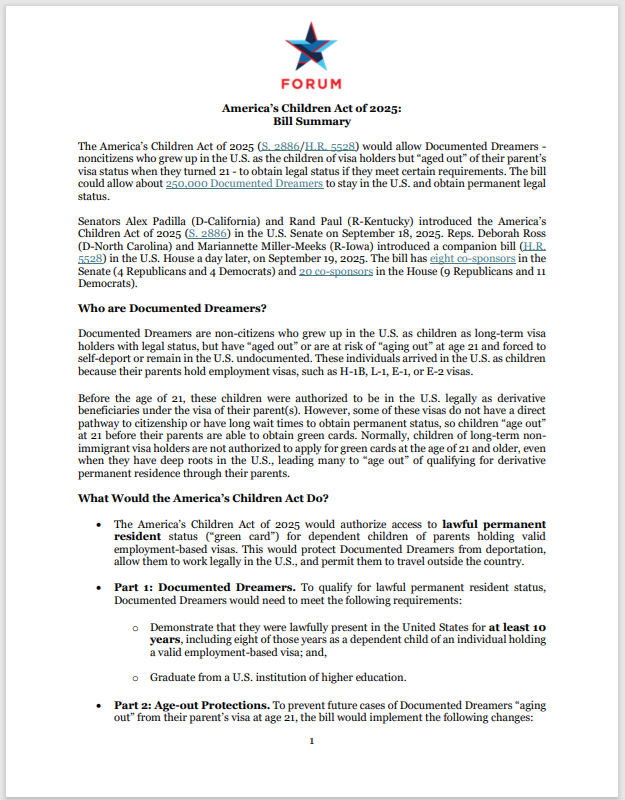 The America’s Children Act of 2025 (S. 2886/H.R. 5528) would allow Documented Dreamers – noncitizens who grew up in the U.S. as the children of visa holders but “aged out” of their parent’s visa status when they turned 21 – to obtain legal status if they meet certain requirements. The bill could allow about 250,000 Documented Dreamers to stay in the U.S. and obtain permanent legal status.