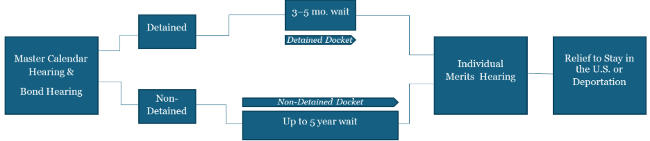 Removal proceedings begin with a master calendar hearing after an individual is issued a Notice to Appear (NTA). Individuals held in detention can typically request a bond hearing to be released, but access has recently been reduced. Following either the master calendar hearing or bond hearing, individuals generally have an individual merits hearing. The wait time for an individual merits hearing depends on whether the individual is in detention or not, with the detention docket historically moving much faster.