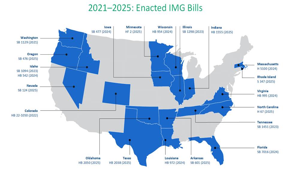 For individual states, the important role immigrants played during the pandemic helped push a number of them to find ways to remove licensing barriers that prevented many immigrants with professional credentials — including those with relevant overseas healthcare workforce educations and licenses – to enter the workforce in their sectors of expertise. This has continued and a growing number of states are working to address these licensing barriers. As report by WES, as of early July 2025, twenty states (Washington, Colorado, Illinois, Tennessee, Idaho, Iowa, Wisconsin, Massachusetts, Virginia, Louisiana, Florida, Arkansas, Indiana, Minnesota, North Carolina, Nevada, Oregon, Oklahoma, Rhode Island, and Texas), have passed legislation to remove licensing barriers for International Medical Graduates (IMGs).