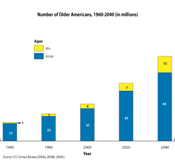 Even beyond the Boomer generation, the U.S. population at large is aging, as lifespans grow and families have fewer children. Studies have projected that between 2000 and 2040, the American population age 65+ will double to 80 million, representing 1 out of every 5 people in the U.S. Those ages 85 and older are projected to quadruple in the same time period.