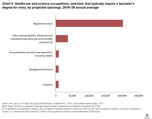 As dire as the physician shortage is shaping up to be, the nursing shortage will likely be worse in terms of sheer numbers, not necessarily in terms of percentage growth. The U.S. Bureau of Labor Statistics projects that, out of all healthcare and science-related positions, U.S. demand for RN’s will be the largest by far. To meet the growing demand for nurses, the U.S. will need to add an average of more than 200,000 additional RN’s every year to the workforce between 2016-2026.